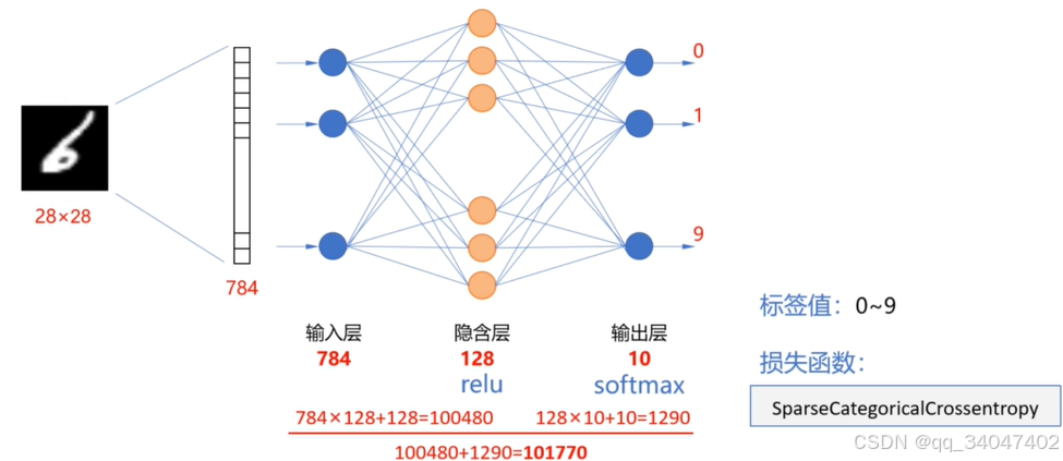 1.keras的minist中有6万条训练集以及1万条测试集。其中每条都是28x28的手写数字。下图所示。可以使用如下的神经元结构进行训练识别。