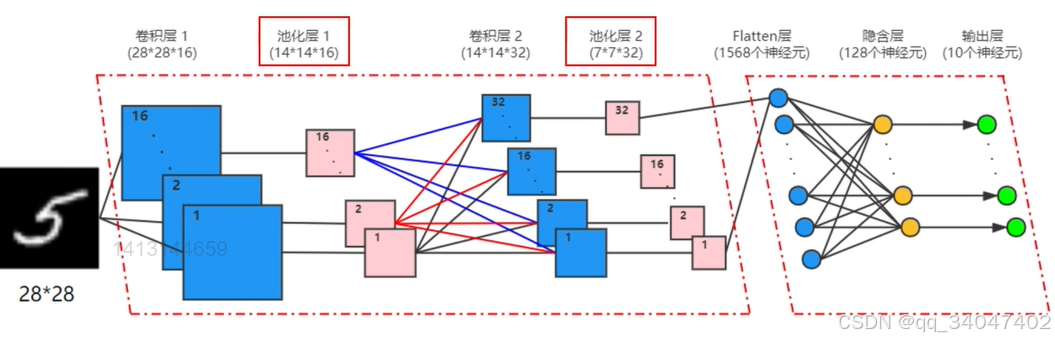 1.层级如下:针对mnist手写28x28的图片,使用卷积神经网络进行训练: