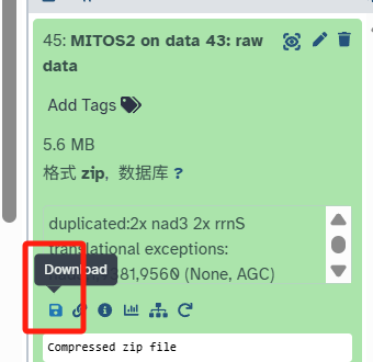 本地版注释软件需要自行下载参考基因组并解压,参考基因组托管在 zenodo 数据库中(MITOS, MITOS2),由于网络原因可能打不开,可以尝试使用下面的指令下载。类比 3.3 的说明,推荐使用 89 版本的参考基因组 89m 表示后生动物,89f 表示真菌,89o 表示动物和真菌,推荐需要哪个下载哪个。