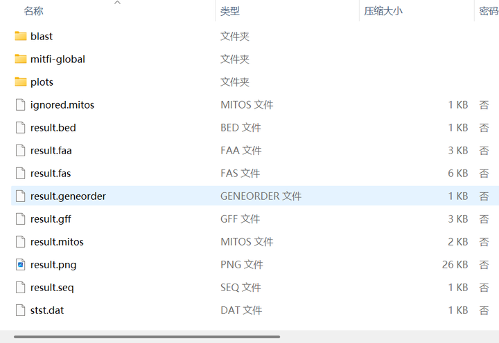 result.mitos:mitos 格式注释文件,里边包含的信息最多,其中起止位置坐标从 0 开始,实际位置坐标应该是表格中的数字加 1;