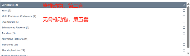在密码子表处选择物种线粒体对应的密码子表,注意:无论什么物种,只要是核基因都是严格遵循标准密码子表的,只有线粒体和质体基因可能有其他遵循,由于本教程是面向线粒体基因组的,所以需要按照实际调整。脊椎动物线粒体是第 2 套密码子表,无脊椎动物线粒体是第 5 套密码子表,更多物种的密码子表遵循规则可以参考 NCBI 提供的网页:HTTPS://www.ncbi.nlm.nih.gov/Taxonomy/Utils/wprintgc.cgi。