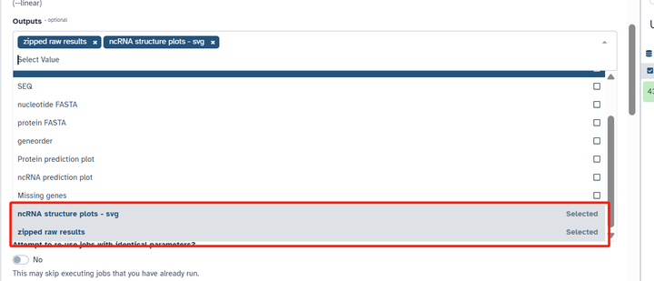因为每个导出文件都需要在后台跑一次程序,所以为了节省时间只需要导出 zipped raw results 即可输出全部内容,但是有时候压缩包里包括的内容不完整,比如 tRNA 的二级结构图是最容易缺失的,所以我们可以顺便把 ncRNA structure plots -svg 勾选上。