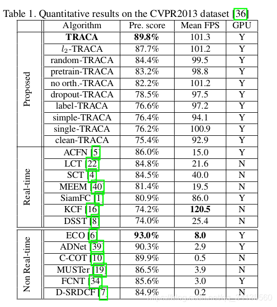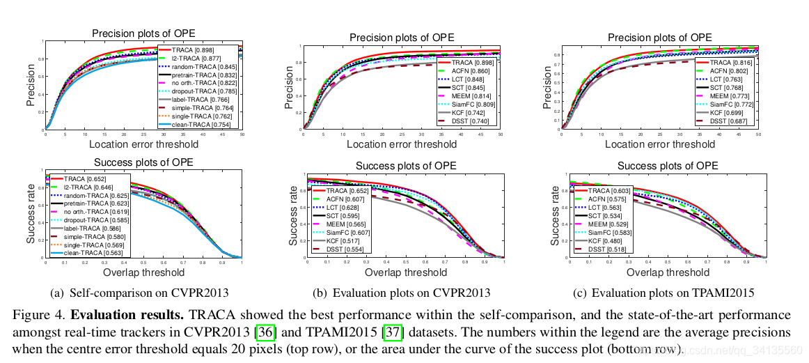 作为性能测量,我们使用[36]中提出的单程评估(OPE)的平均精度曲线。通过平均所有序列的精确度曲线来估计平均精确度曲线,其使用两个来源获得:位置误差阈值和重叠阈值。作为跟踪器的代表性分数,使用当位置误差阈值等于20个像素时的平均精度和成功曲线的曲线下面积。