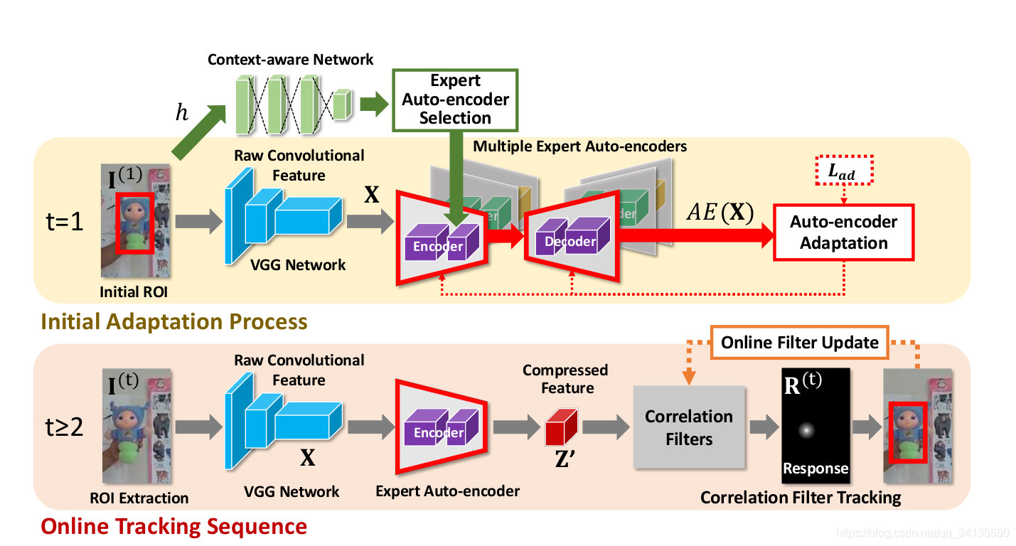 为了跟踪场景中的目标,我们依赖于基于相关滤波器的算法,该算法使用由上下文感知网络选择expert auto-encoders的压缩特征图。我们在3.4.1节中描述了所选expert auto-encoders的初始适配,然后在Sec3.4.2中介绍了基于相关滤波器的跟踪算法。