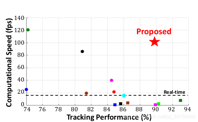 基于在线深度学习的跟踪器:最近基于在线深度学习的跟踪器[24,29,34,35,39]已经超越以前基于低级特征的跟踪器。王等人 [34]提出了一个同时利用浅层和深层卷积特征的框架,分别考虑目标的详细和上下文信息。Nam和Han [24]引入了一种新颖的训练方法,通过将分类层附加到在线更新的卷积神经网络来避免过度拟合。Tao等人[29]利用暹罗网络来估计目标的先前出现与当前候选区域之间的相似性。Yun等 [39]提出了一种新的跟踪方法,该方法使用动作决策网络,该网络可以通过具有弱标记数据集的强化学习方法进行训练。然而,基于在线深度学习的跟踪器需要频繁地对网络进行微调,这很慢并且禁止实时跟踪。David等 [15]和Bertinetto等 [1]提出了预先训练好的网络,无需在线微调即可快速跟踪目标,但这些跟踪器的性能低于最先进的跟踪器。
