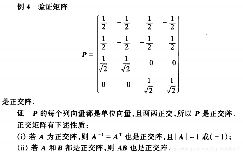正交矩阵的意思就是,P有四个列向量,第一个列向量与自身向量内积是1,而与其它三个向量内积是0(也就是垂直),内积就是点乘,cos