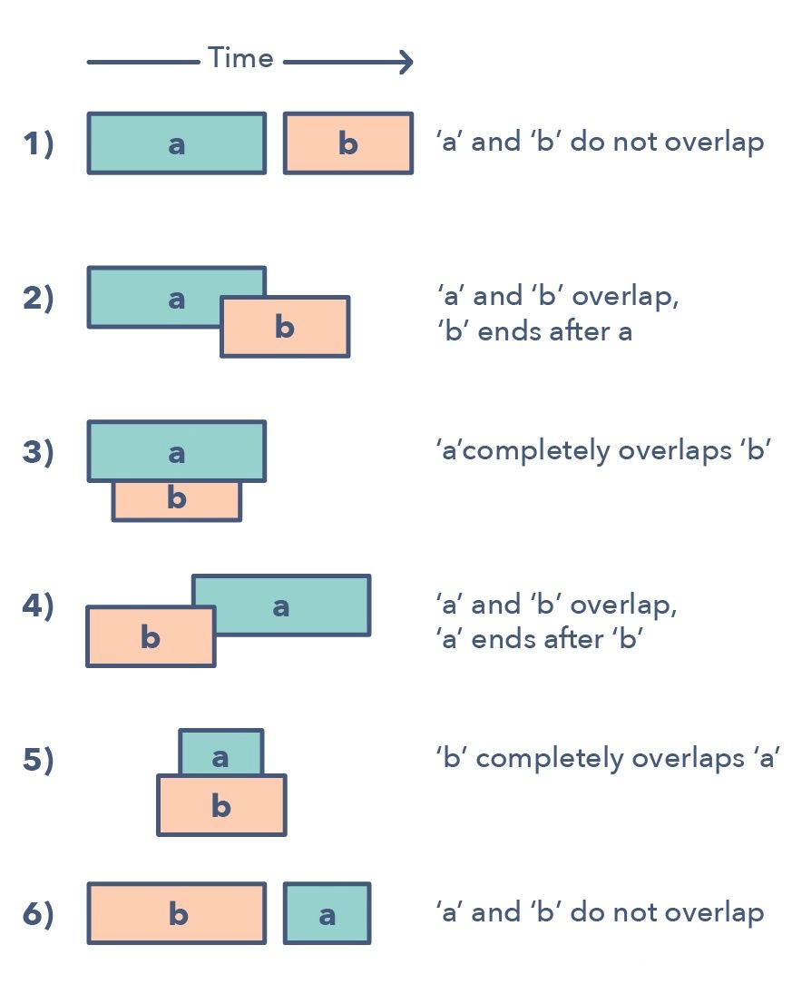区间合并模式是一个用来处理有区间重叠的很高效的技术。在涉及到区间的很多问题中,通常需要判断区间是否有重叠,重叠的话则合并区间。- 给两个区间a和b。它们之间的关系能跑出来6种情况: