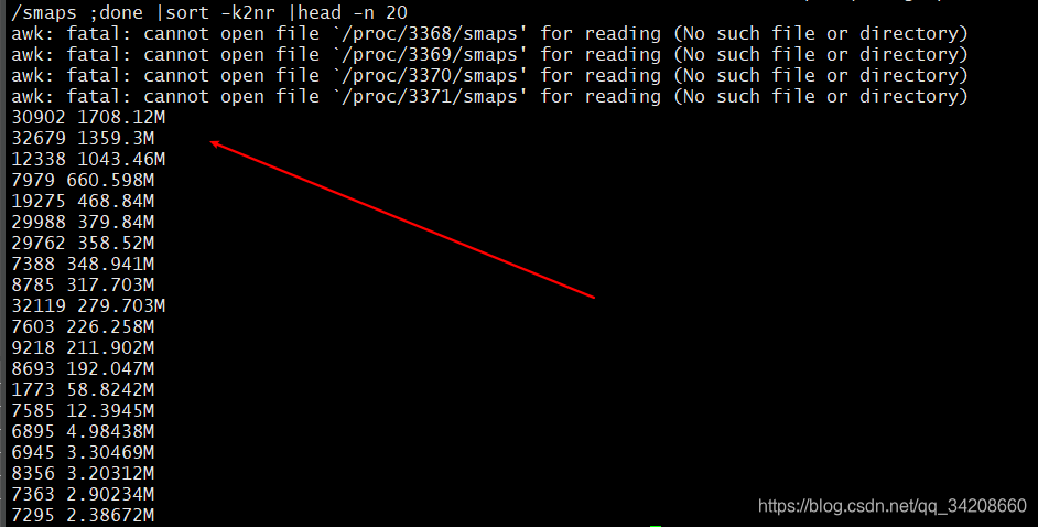 for i in `cd /proc;ls |grep "^[0-9]"|awk ' $0 >100'` ;do awk '/Swap:/{a=a+$2}END{print '"$i"',a/1024"M"}' /proc/$i/smaps ;done |sort -k2nr |head -n 20