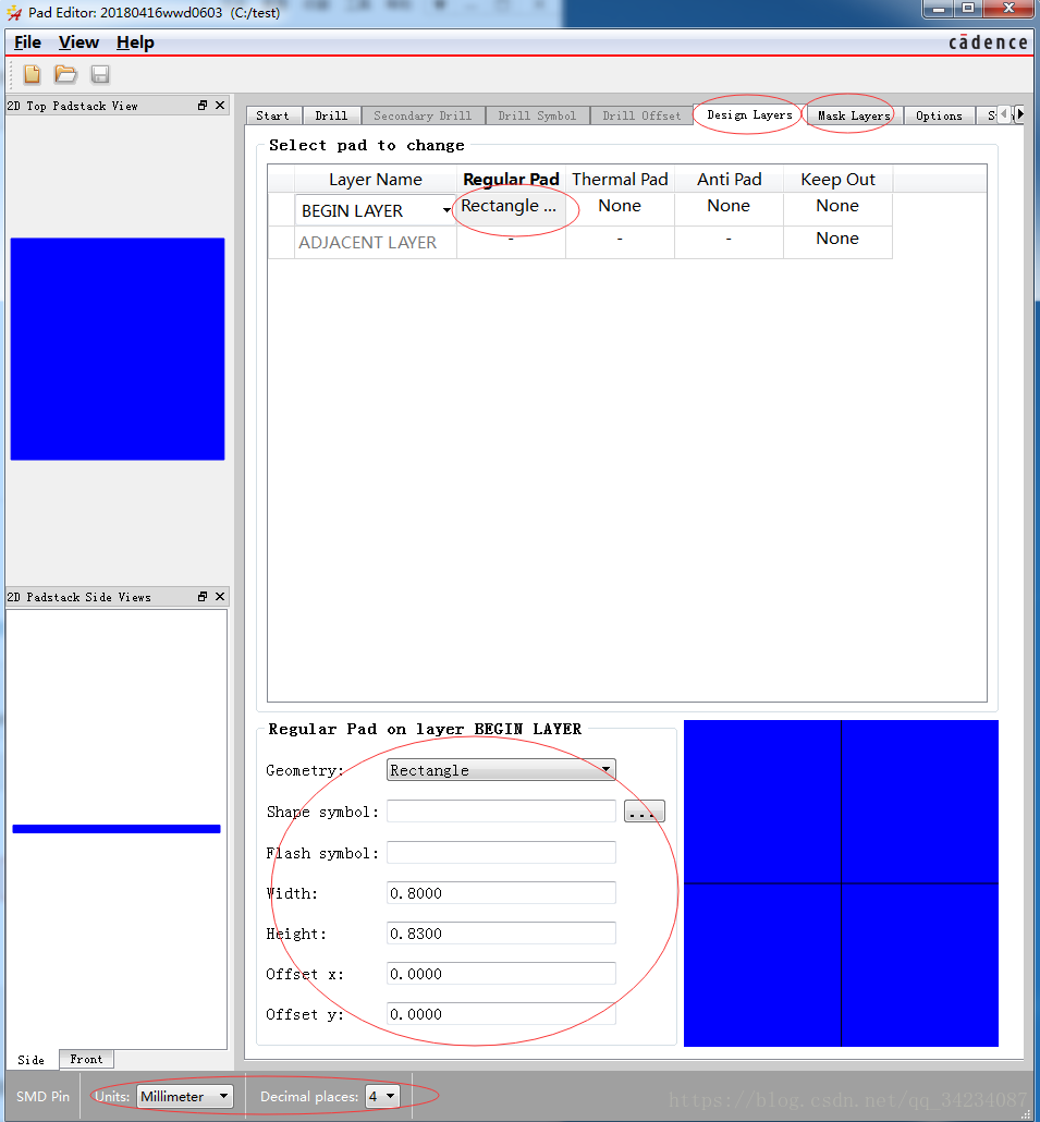 选择Design Layers标签,点击BEGIN LAYER 的Regular Pad,在下方填写长宽