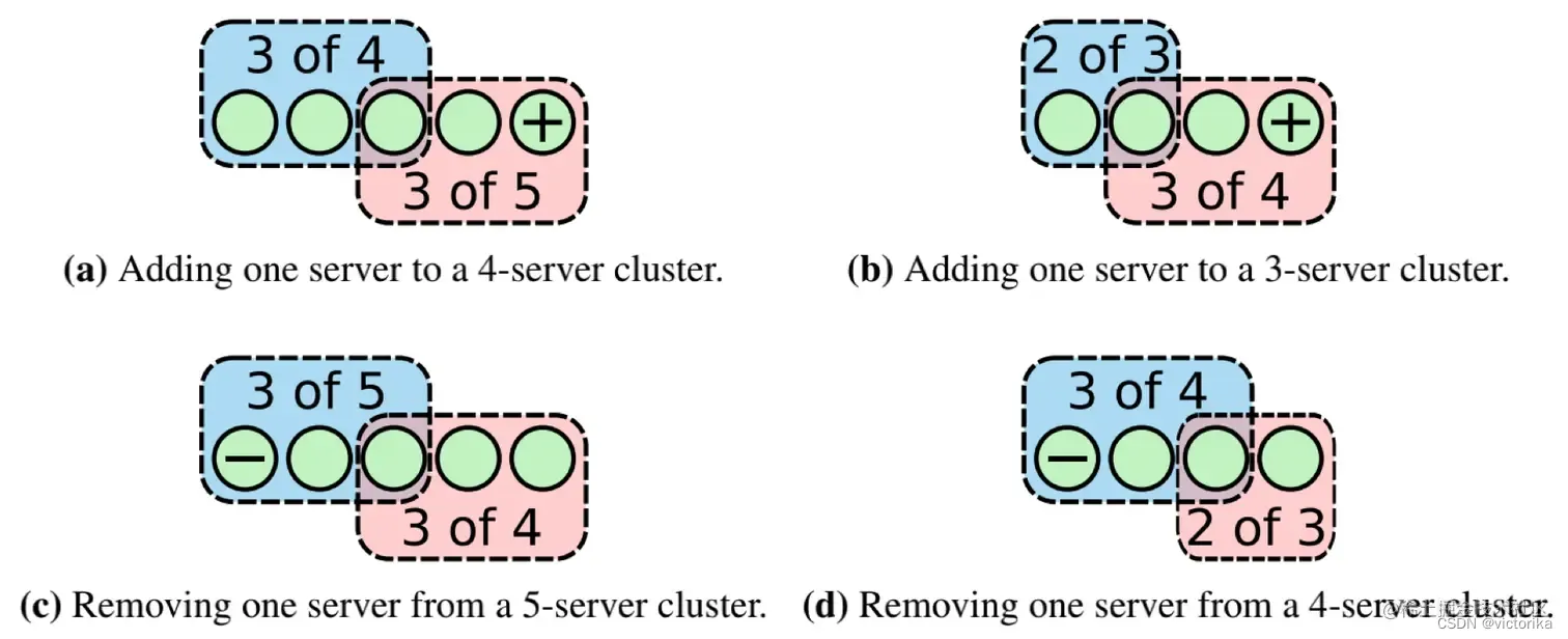 可以观察到,在单节点变更下,无论是哪一种情况,新旧配置中的大多数节点总会存在一个交集节点。由于Follower只能给一个Server投票,因此不会有多个节点满足大多数节点的投票要求,最多只会产生一个Leader。