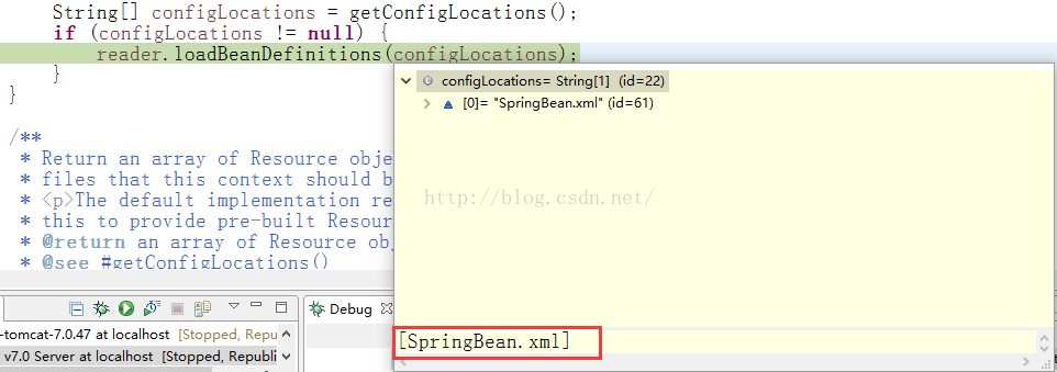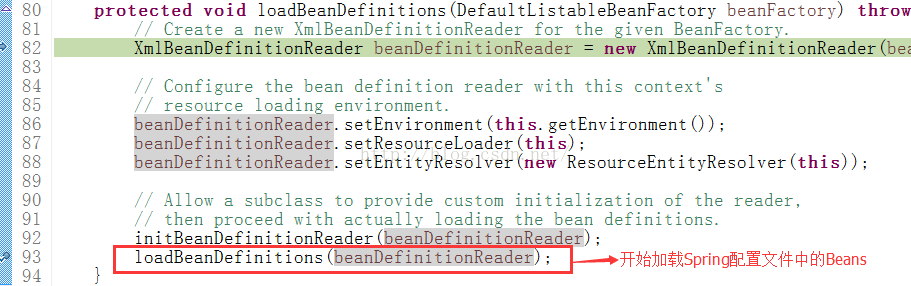 loadBeanDefinitions进行Beans的读取和载入,下面可以看到找到了Spring的配置文件,并且遍历对其(这里只有