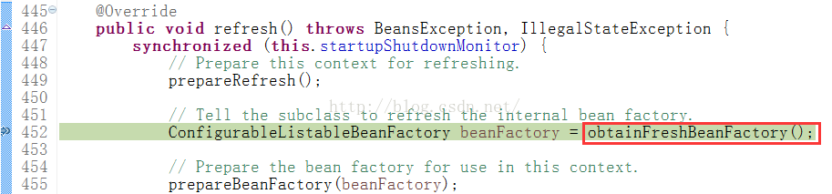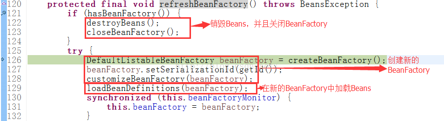 obtainFreshBeanFactory方法如下:它先使用refreshBeanFactory销毁Bean,BeanFactory然后分别生成BeanFactory,Bean,