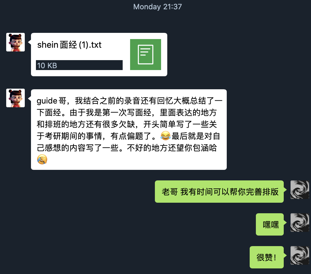总体感觉 shein 的面试效率还是很高的,基本一天一面。 HR 的态度非常好,中间由于一些事情耽误,还鸽了一次技术面试,HR 根据我的时间以及面试官的时间帮我额外安排了一次面试。对这家公司的映像非常好。