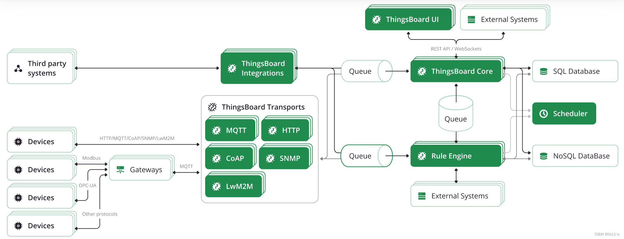 Apache Kafka是一个开源的流处理软件平台。ThingsBoard 使用 Kafka 来保存来自 HTTP/MQTT/CoAP 传输的传入遥测,直到它被规则引擎处理。ThingsBoard 还使用 Kafka 进行微服务之间的一些 API 调用。从 2.5 版本开始,我们已经从使用gRPC切换到 消息队列 来进行 ThingsBoard 组件之间的所有通信。主要思想是牺牲小的性能/延迟损失,以支持持久可靠的消息传递和自动负载平衡。