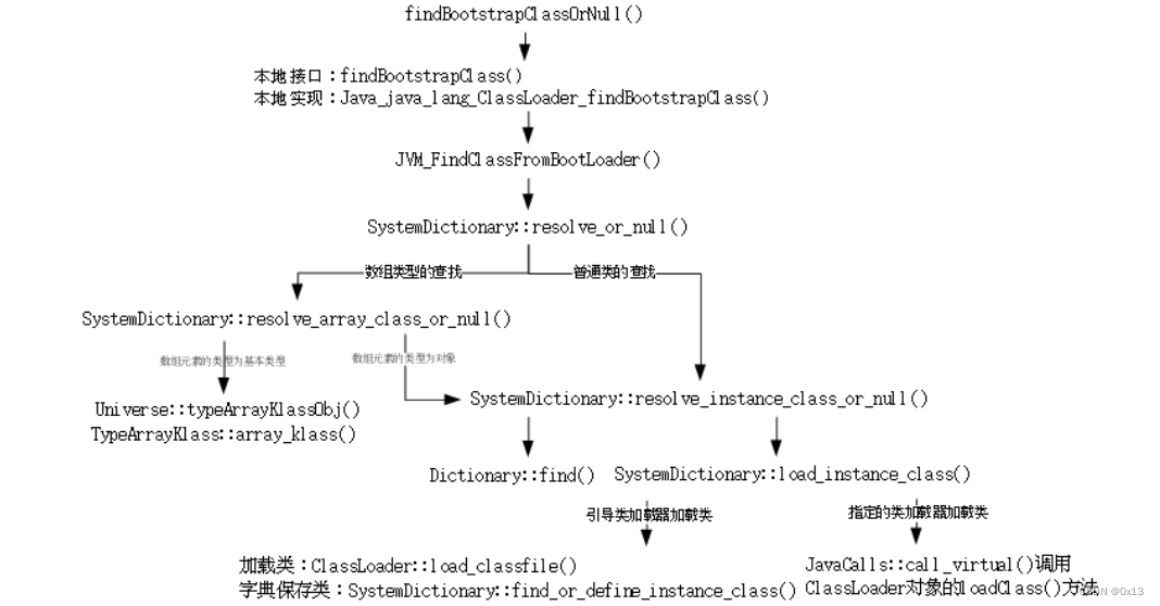 hotspot/src/share/vm/classfile/systemDictionary.cpp resolve_instance_class_or_null() => 在变量SystemDictionary::_dictionary中查找是否类已经加载,从字典中没有找到时,需要对类进行加载