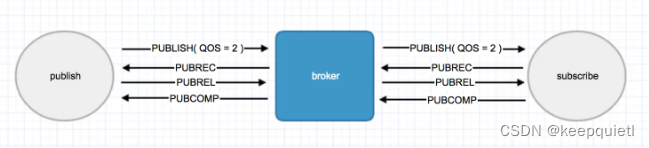 QoS 2:只有一次传输。确保消息只送达一次,提供完全可靠的传输。