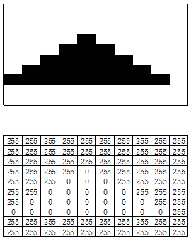 黑白图像常采用灰度图的方式存储,即图像的每个像素填充一个灰阶值,256阶灰度图是一个灰阶值取值范围为0-255的灰阶矩阵,0表示全黑、255表示全白,范围内的其他值表示不同的灰度,比如下面的图像及其对应的灰阶矩阵: