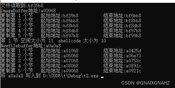 printf("复制第 %d 个节 起始地址:%x \t 结束地址:%x \n",i,pimagebuffer + (*pvirtualaddress),pimagebuffer + (*pvirtualaddress)+ *pmisc);