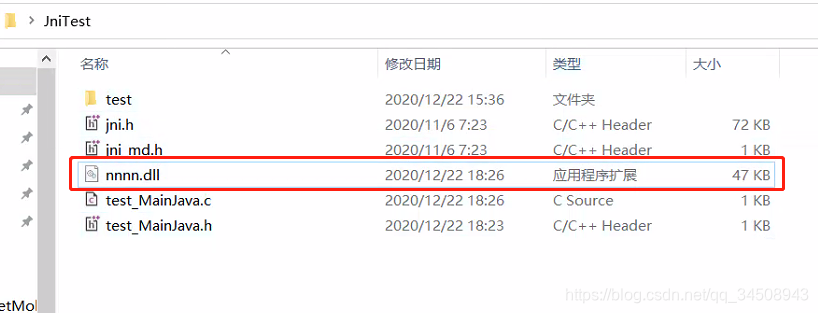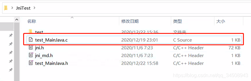 4.以上代码了解后,开始引入jni库,库的路径在../jdk路径/include目录下,将目录下的jni.h和../jdk路径/include/win32目录下的jni_md.h拷贝到项目中,与上面生成的test_MainJava.h头文件同级目录存在,如下图所示