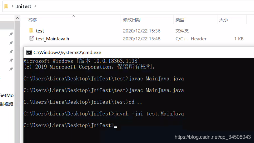 2.再次输入javac MainJava.java 点击Enter,没有报错,然后退出到JniTest目录下(项目中就是包名外,与包名同级目录),运行javah -jni test.MainJava(包名.类名),完成后,可以看到包名同级目录下会生成一个test_MainJava.h的头文件