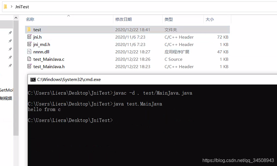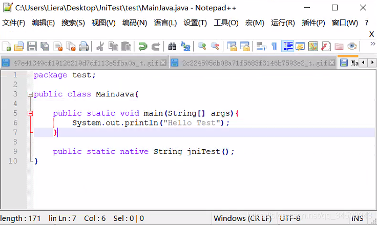 注意: 直接在JniTest目录下使用命令行,不要进入test目录下去编译,本次编译不像上面那样,上面只是为了测试能否生成class文件