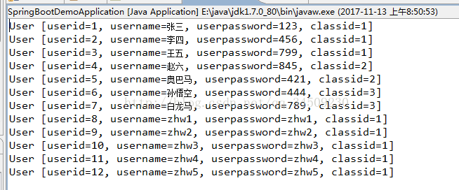 - 运行结果如下,运行入口函数SpringBootDemoApplication,然后在浏览器输入http://localhost:8080/findAllUser.action