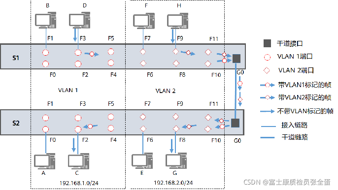vlan2的计算机发广播,就带着vlan2的标记,会广播到vlan2的这些口,不会广播到vlan1。
