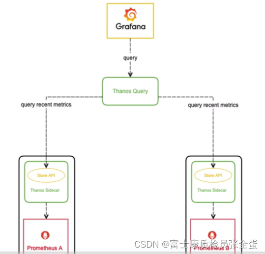 这样屏蔽了一些细节,如不需要知道背后有多少个Prometheus,客户端只需要知道query的地址就能够拿到完整的数据。