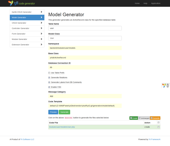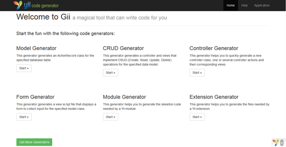 yii2框架提供的生成工具有6个:Model,CRUD,Controller,Form,Module,Extension