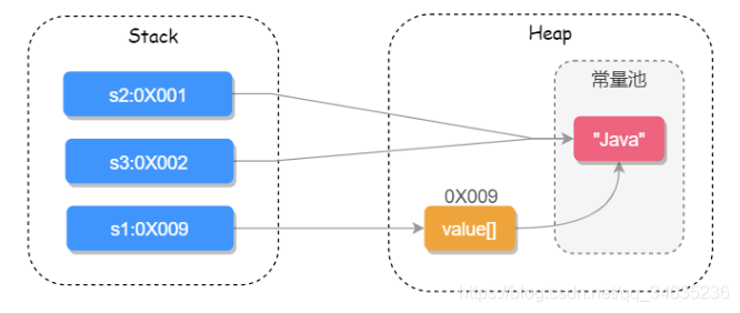 String 常见的创建方式有两种,new String() 的方式和直接赋值的方式,直接赋值的方式会先去字符串常量池中查找是否已经有此值,如果有则把引用地址直接指向此值,否则会先在常量池中创建,然后再把引用指向此值;而 new String() 的方式一定会先在堆上创建一个字符串对象,然后再去常量池中查询此字符串的值是否已经存在,如果不存在会先在常量池中创建此字符串,然后把引用的值指向此字符串,如下代码所示:
