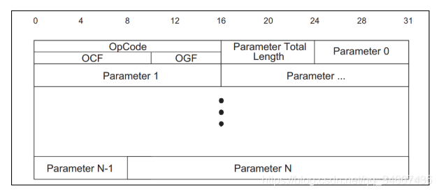 其中opcode(操作码)由ogf(opcode group field,6个bits)和ocf(opcode command field,10个bits)组成,虽然第三个字节的低两位是OCF的高两位,但是因为这两个字节一般是0,所以一般我们的换算方法就很简单了,OCF就是第二个字节,OGF是第三个字节右移两位
