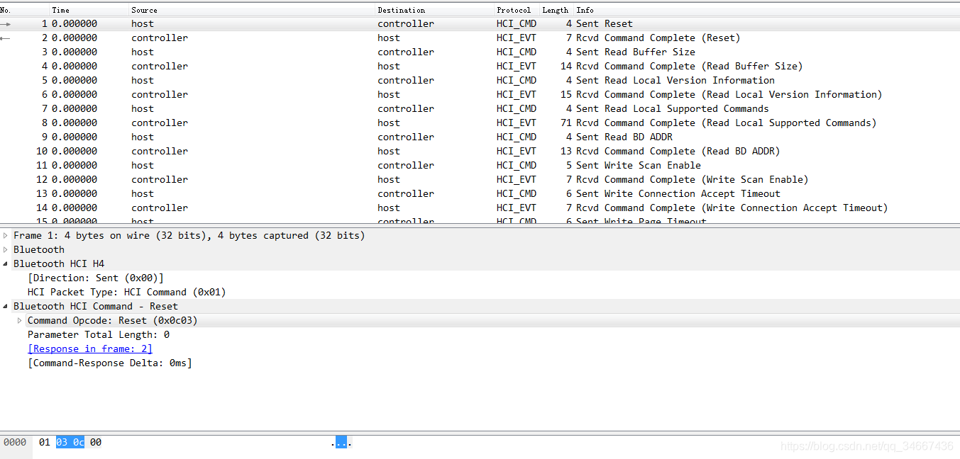 第一个字节01表示packet type: HCI Command