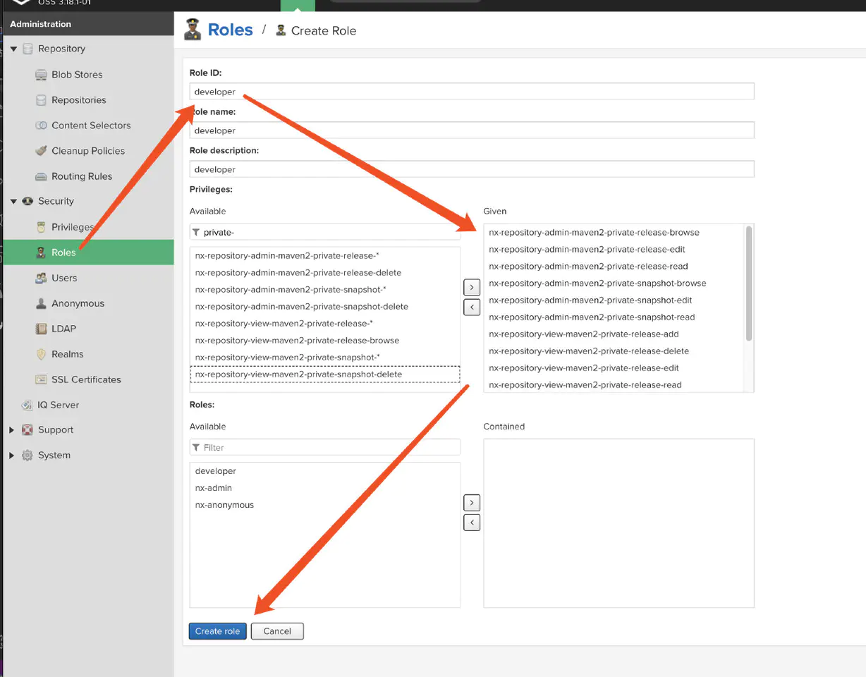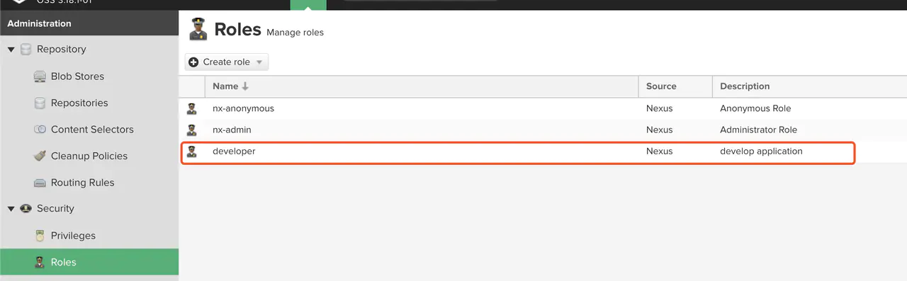 Nexus 默认只有两种角色:nx-anonymous 和 nx-admin,前者只有浏览的权限,后者为管理员权限,一般情况下,我们还需要正对开发人员创建个角色。点击 Create Role,添加一个 Role ID 为 developer 的自定义角色, 并且只添加自定义仓库的使用权限,删除操作除外。