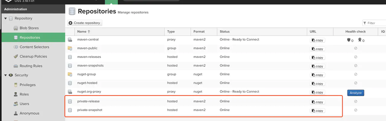 最后点击蓝色按钮-Create repository 之后,就可以在仓库列表看到自定义的仓库了,有了 release 仓库,我们再按照同样方式操作添加一个 snapshot 仓库,只需在 Version policy 一栏调整为 Snapshot 即可。