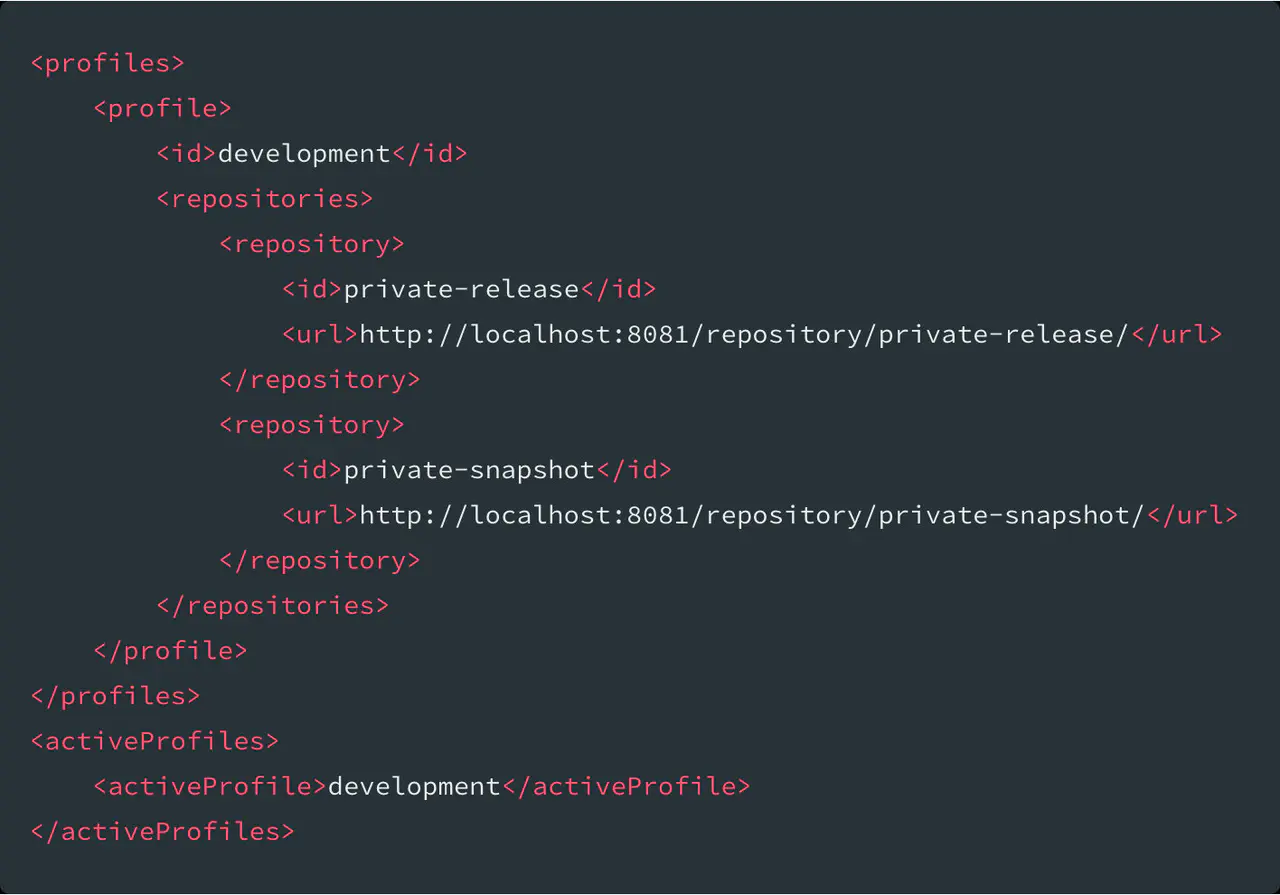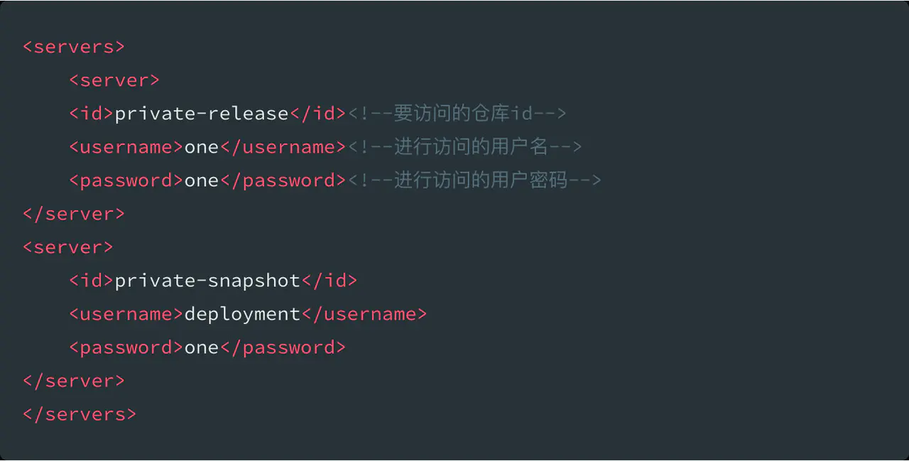 有了私服和用于开发的账号,我们就需要在本地 Maven 配置文件 setting.xml 进行关联。