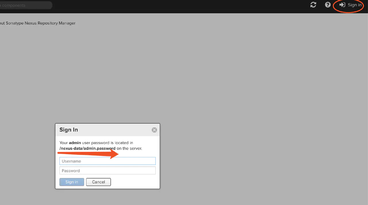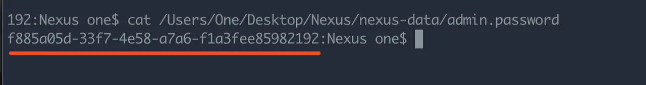 说明了 Nexus 默认登录账号为 admin,并且密码位于文件 /nexus-data/admin.password 下,我们只需在本地配置的挂载目录下查看该文件即可,或者进入docker的nexus容器内部(使用 docker exec -it 容器id /bin/bash 命令)查看