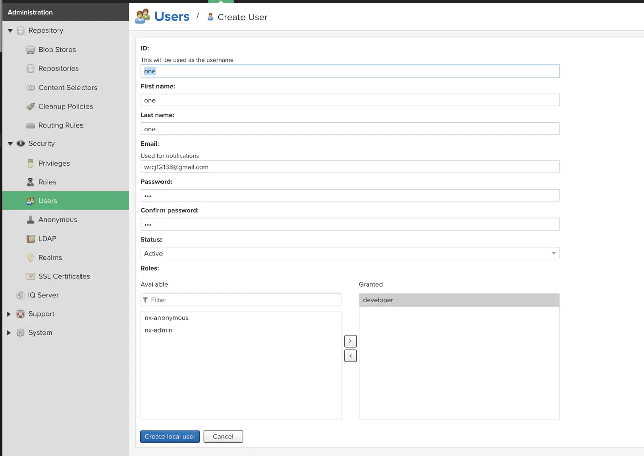 跟权限类似,默认的用户只有两种:admin 和 anonymous,我们同样需要创建属于开发者的用户对象。点击 Create local user,填入用户名,密码等必填信息之后,关联我们先前的创建的角色,并保存即可。