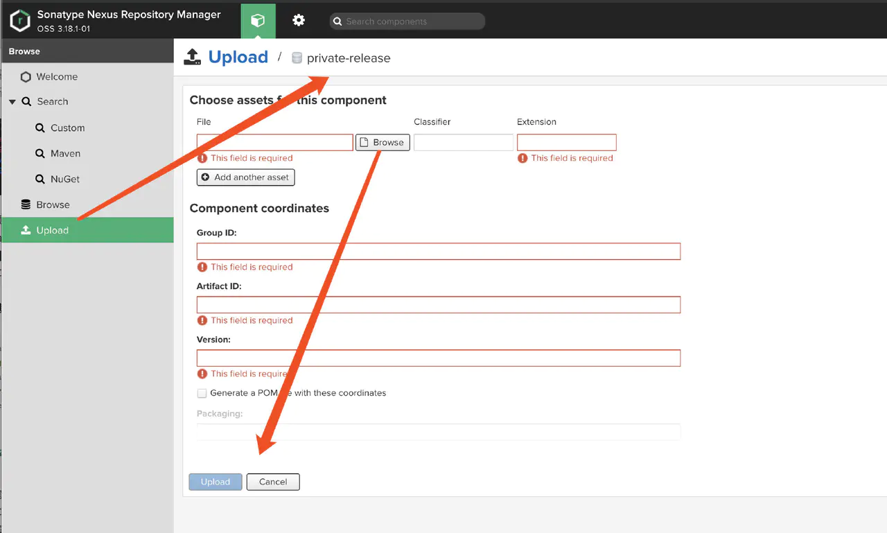 可视化界面操作:就是在 Nexus 后台上进去,执行上传操作必须要对于的上传权限才可以,一般都是管理员账号进行操作,选择仓库后进去上传页面,指定本地需要上传的项目,自定义完坐标信息保存即可。