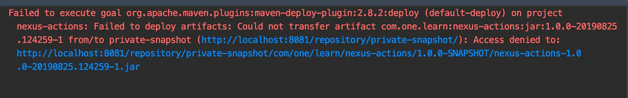 如果部署过程中出现如下提示:带有 Access denied to 则说明在 setting.xml 配置的用户权限不足,无法将 jar 部署到对应私服仓库上去。