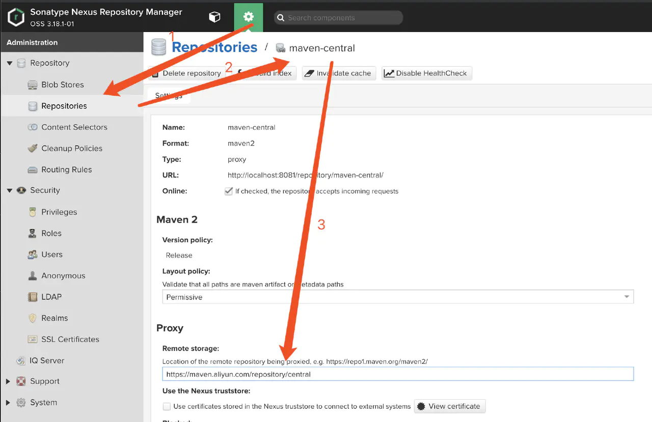将私服配置里中央仓库的代理仓库路径更新为阿里云仓库提供的代理地址:http://maven.aliyun.com/repository/central 这样一来可以更快速地访问在中央仓库上所需要的依赖和插件。