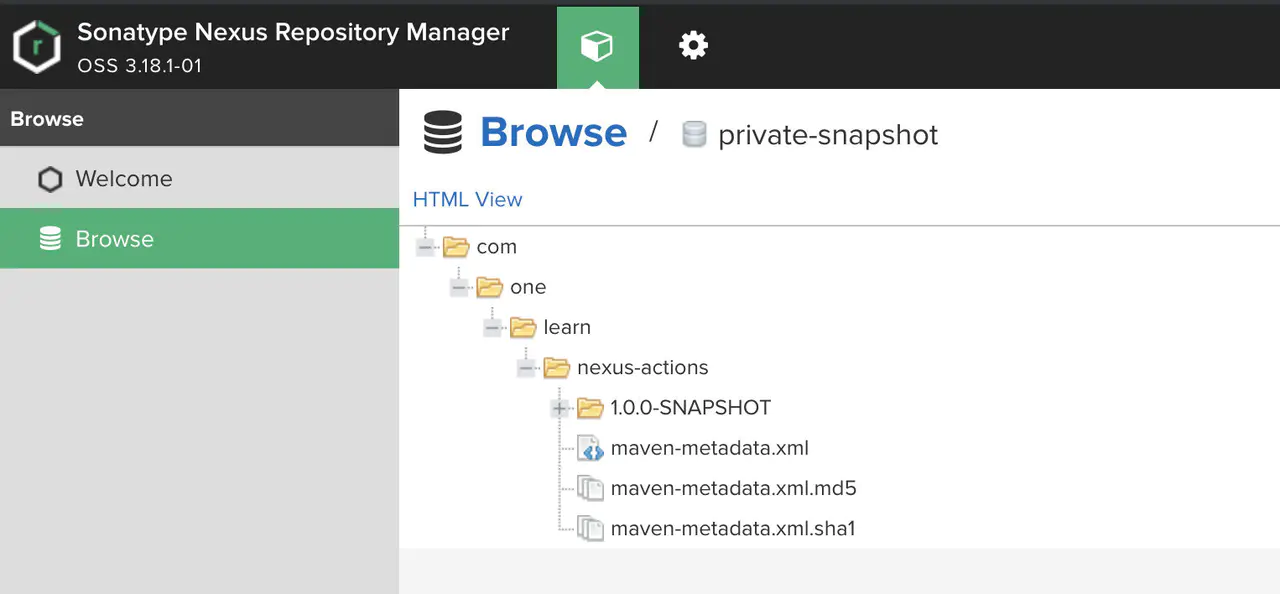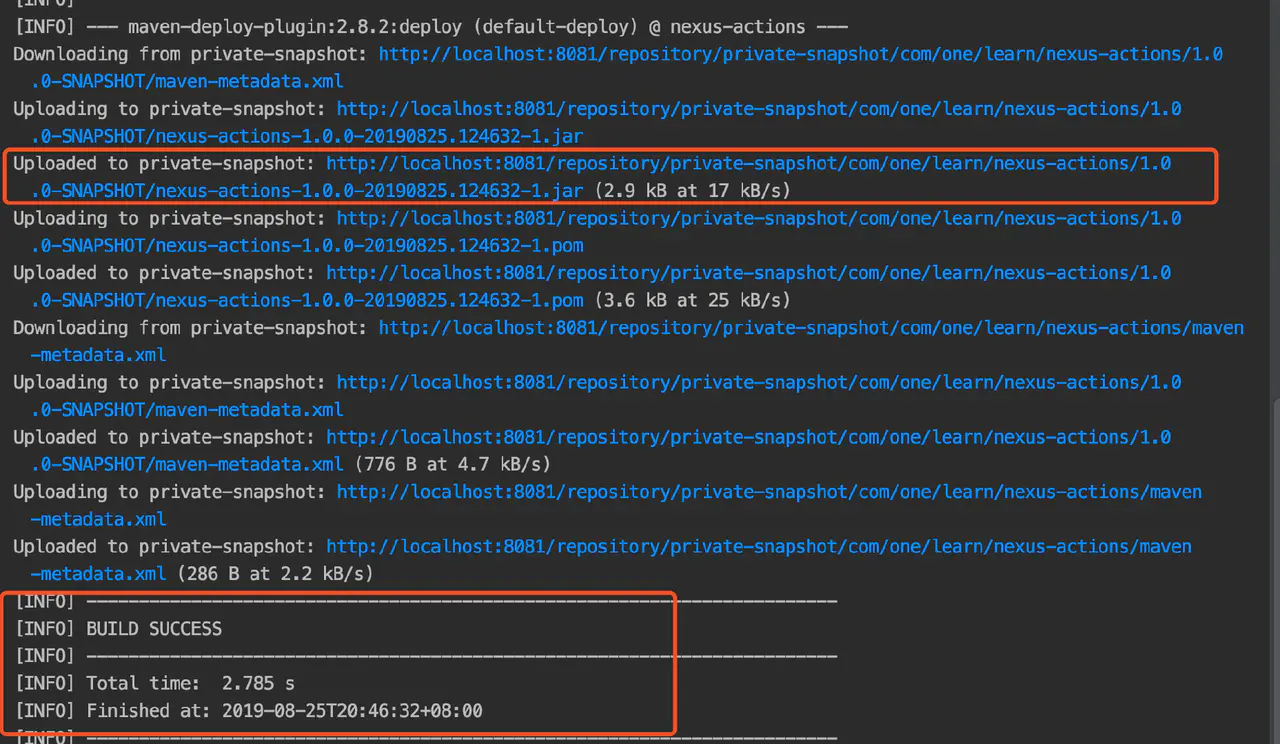 需要注意的是,对于一个Maven项目而言,如果项目的版本号中有 “SNAPSHOT” 字样,则表示当前处于开发版本,Maven 会将发布到 snapshotRepository 节点对应地址上去。否则,Maven则认为这是一个发布版本,将程序发布到 repository 节点对应的地址上。由于示例项目的版本为 1.0.0-SNAPSHOT ,所以最终项目上传到了 private-snapshot 这个 Snapshot 类型的仓库下。