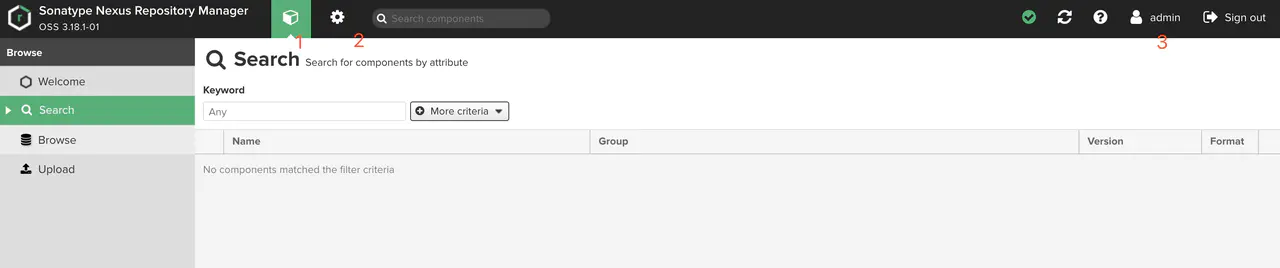 - 默认的浏览界面,可以搜索查看仓库的组件,以及进行上传操作。