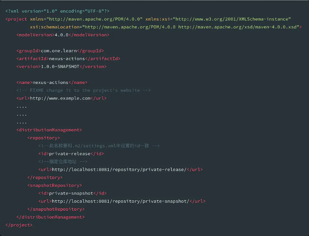 配置完成后,我们可以创建一个Maven工程,尝试下打包到 Maven 私服。利用 IDE 快速生成 Maven 项目,在 POM 文件添加 distributionManagement 节点,并且指定对应的私服仓库 id 和地址,如下: