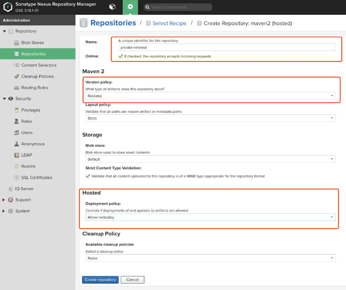 然后输入仓库名称 private-release,并在 Version policy 一栏中选择 Release,表示这个仓库的存储依赖为正式发布的组件,然后在 Deployment policy 一栏中选择 Allow redeploy,允许部署和更新私服上的组件。
