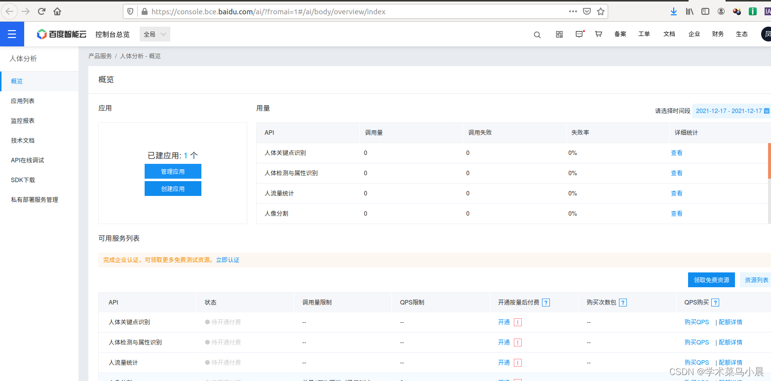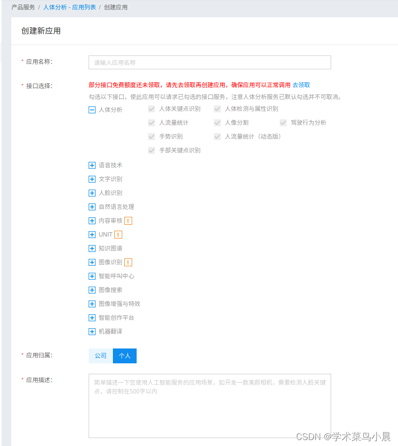 百度AI申请应用,获取 APP_ID API_KEY SECRET_KEY。