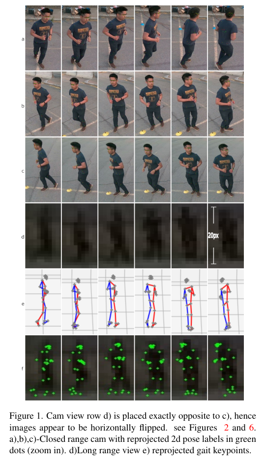 3)背景:目前对于长距离下的人体识别,需要使用除了面部之外的整体身体特征,如步态。然而,用于训练和测试这种识别算法的数据集并不普遍存在,而且标记的数据集更少。