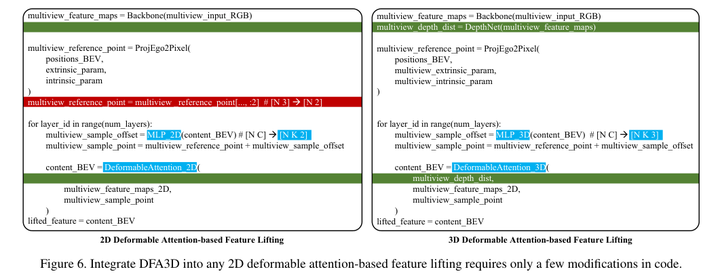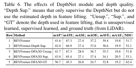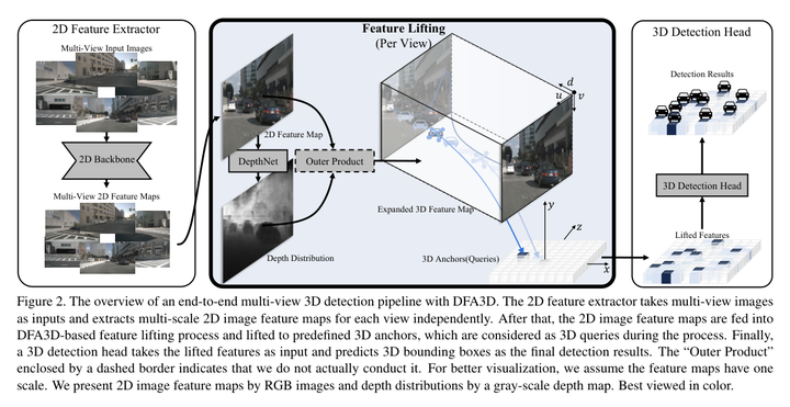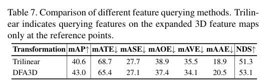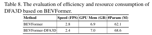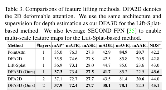 3)方法:本文所提出方法首先利用估计的深度将每个视角的2D特征图扩展到3D,并利用DFA3D从扩展的3D特征图中聚合特征。通过DFA3D的帮助,可以从根本上有效地减轻深度模糊问题,并且通过Transformer-like架构逐层逐渐细化提升的特征。将DFA3D集成到几种使用2D注意特征提升的方法中,只需对代码进行少量修改,并在nuScenes数据集上进行评估。