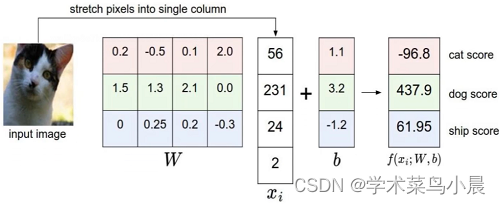 为了计算简单,假设这种猫只有4个像素点,分别是56、231、24、2,分成3个类别(猫、狗、船),其中W有3行对应3个类别,且Xi有4个值对应4个像素点,我们来计算第一行,