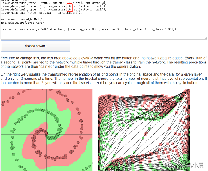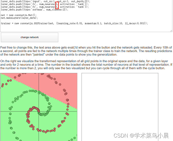 目的是区分绿色和红色的点,当只有1个神经元时,可以明显看到类似一刀切。